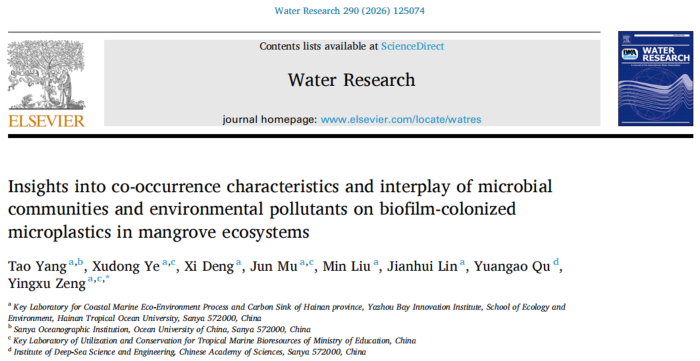 近日,生态环境学院曾映旭教授团队在国际环境领域顶级期刊《Water Research》(中科院I区TOP,Nature Index期刊,IF=12.4)上发表了立足于海南自贸港国家生态文明试验区建设的研究成果“Insights into co-occurrence characteristics and interplay of microbial communities and environmental pollutants on biofilm-colonized microplastics in mangrove ecosystems”,揭示了典型热带海洋生态系统中生物膜微塑料协同富集微生物、重金属及持久性污染物的复杂过程与驱动机制。该期刊由国际水协会(International Water Association)主办,创刊于1967年,是环境科学与生态学领域最具权威性的期刊之一。